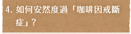 每天靠咖啡因提神,要如何不再依賴呢?突然不喝咖啡因飲品可能會有頭痛、精神不濟、無法專心、情緒不佳等戒斷症狀。初期幾天可能是戒斷症狀感受最顯著的時候,通常2-9天便會自然緩解,食欲也會慢慢改善,如果真的承受不了也可以採漸進式減少攝取量的方式,例如:咖啡可以由大杯換小杯、從每天喝改成隔天喝等方式。這樣漸進式的降低咖啡因攝取量,並增加水分補充,選擇檸檬水、或無咖啡因的草本茶來取代,例如不含咖啡因的「十六茶」就是很好的選擇,讓身體逐漸適應濃度變化,才能順利擺脫咖啡因成癮。
